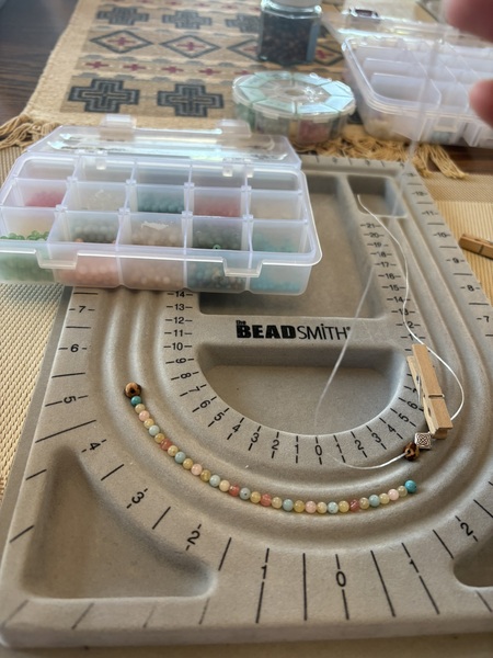 大きな特徴は、通称”ゴーストビーズ”を使うこと。ネイティブアメリカンのナバホ族の間で、魔よけ用に子どもたちに持たせていた、ジュニパーの実のことだそうです。自分も2粒ほど取り入れてみました!また、アリゾナ州の石である、ターコイズも使用し、色とりどりの可愛いブレスレットが完成しました👏