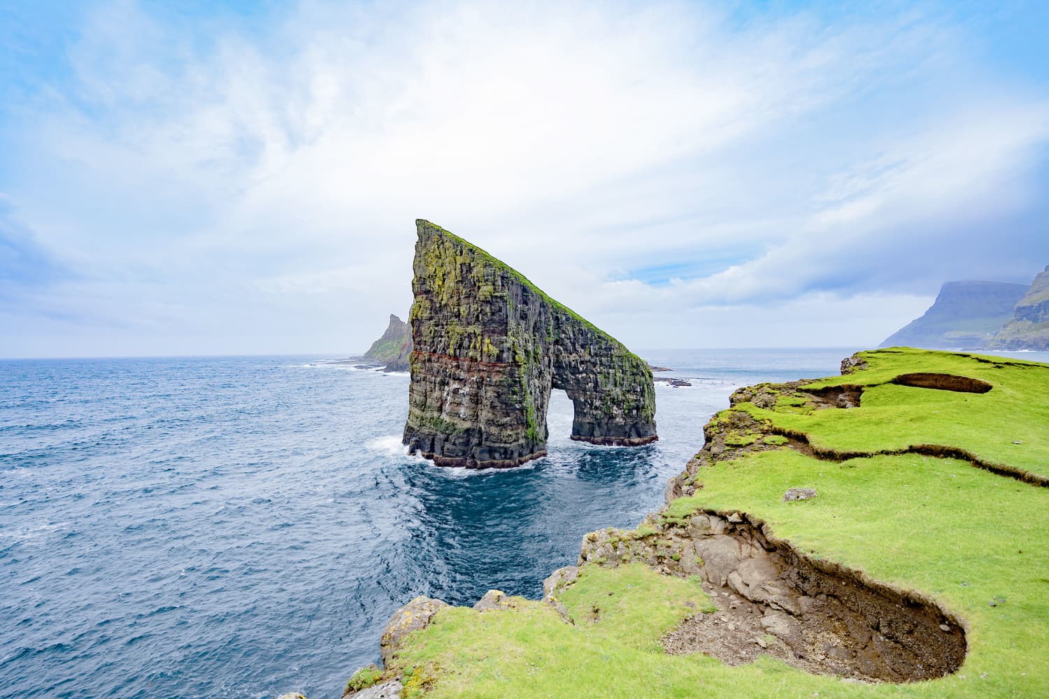 ヴォーアル島は、フェロー諸島の玄関口として知られ、壮大な自然が広がる絶景スポットが満載の島です。断崖から海へ流れ落ちるムラフォスル滝や、湖が海に浮かんで見える不思議な景観のソルヴァグスヴァテン湖など、写真映えする風景が魅力です。空港もありアクセス抜群で初めてのフェロー諸島旅行にも最適な島です。