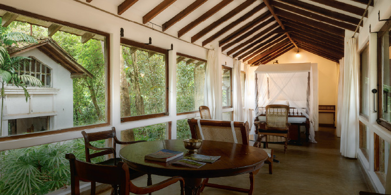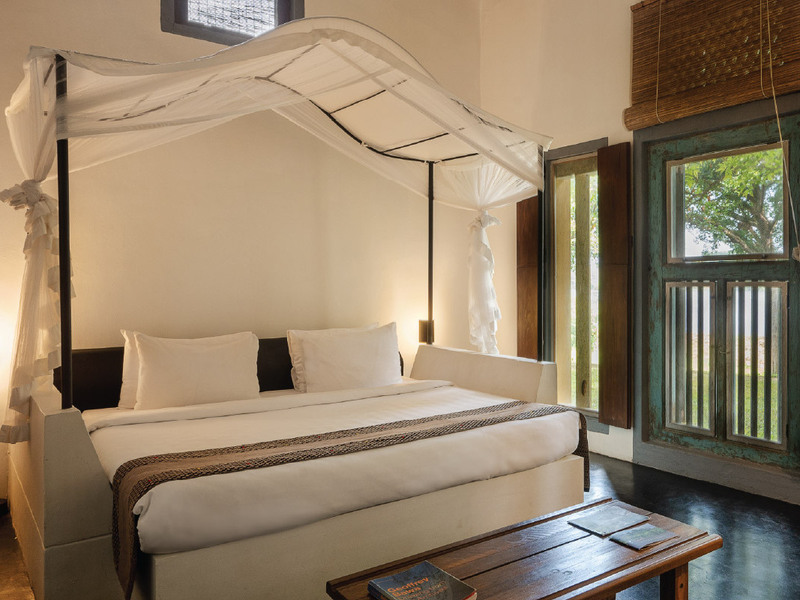 このお部屋はガラス張りの窓で囲まれており、ガラスはバワが普段あまり使わない素材ですが、ここでは珍しく全面的に使用されています。外には固有種の鳥が住む成熟した木々が、風に揺れながらそっと立っています。お部屋にはクイーンサイズの四柱式ベッドがあり、木製のヴォールト型天井の下に配置されています。家具には、植民地時代のプランターズチェアやオランダ時代のアンティーク、そして快適な滞在のための現代的な設備が揃っています。専用のバスルームには、洗面台とシャワーが備えられています。