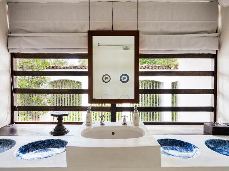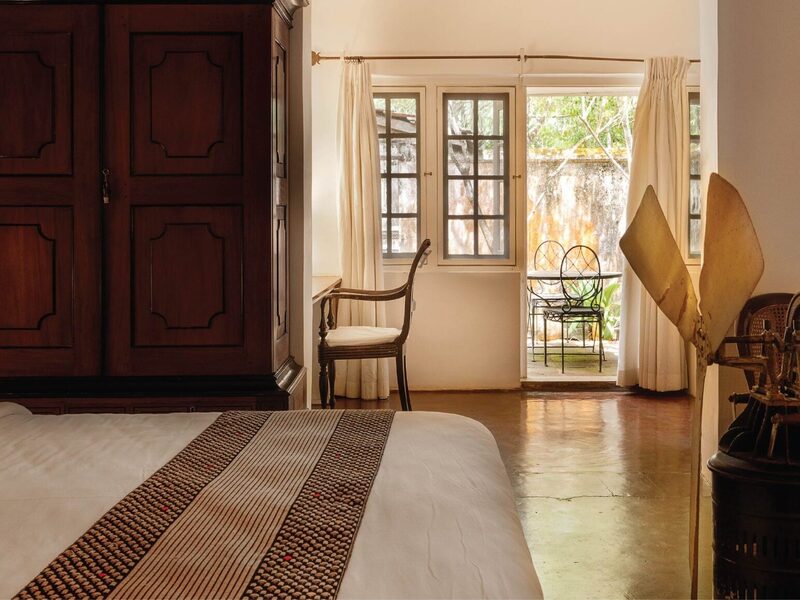 ルーム名の「Ena」が示す通り、こちらはスリランカの著名なバティックアーティスト、エナ・デ・シルヴァのが使用していたベッドルームです。エナのベッドルームは、キングサイズのプラットフォームベッド、繊細なルーバー窓のブラインド、アンティークのプランターズチェアが特徴の伝統的なスタイルでデザインされています。木製の床が白く塗られた壁と対比を成し、コロニアル時代の雰囲気を保ちながら、現代的な設備が20世紀のエッセンスを加えています。