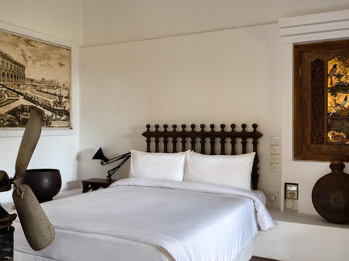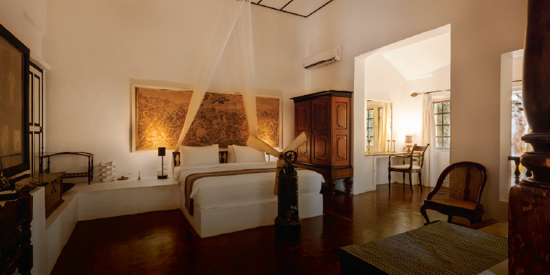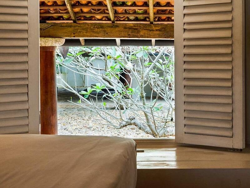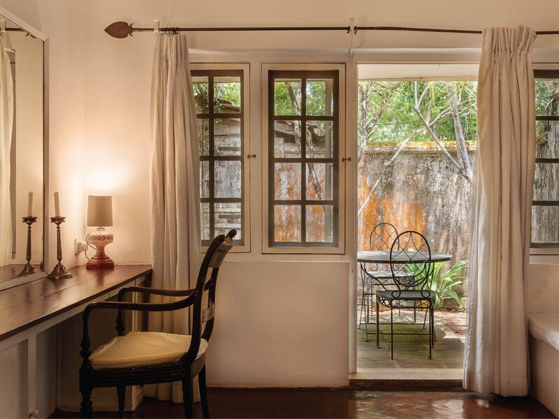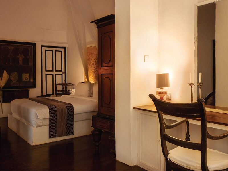 かつて、バワのアートギャラリーだったお部屋です。お部屋の中心には、清潔なリネンで整えられた四本柱のキングサイズのベッドがあり、大きなガラスの窓越しに広々とした中庭を見渡すことができます。様々な場所に置かれた調度品が空気に重みをもたせつつ、アンティークで静謐な雰囲気も持ち合わせた、特別な雰囲気のお部屋です。