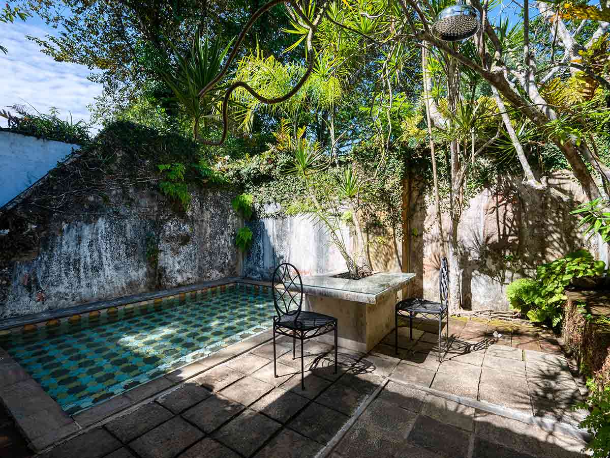 ジェフリー・バワの元寝室があるこちらのスイートには、バワ自身が使っていたクイーンサイズのベッドがあり、現代的な設備と古いアンティークが調和しています。広々としたリビングエリアには、テーブル、アームチェア、本棚も置かれています。スイートはお部屋専用の中庭に面しており、座る場所も用意されています。専用のバスルームとバスタブは、屋外の小型プールと繋がっています。暮らすような滞在を、是非このThe Geoffrey Bawa Suiteで。