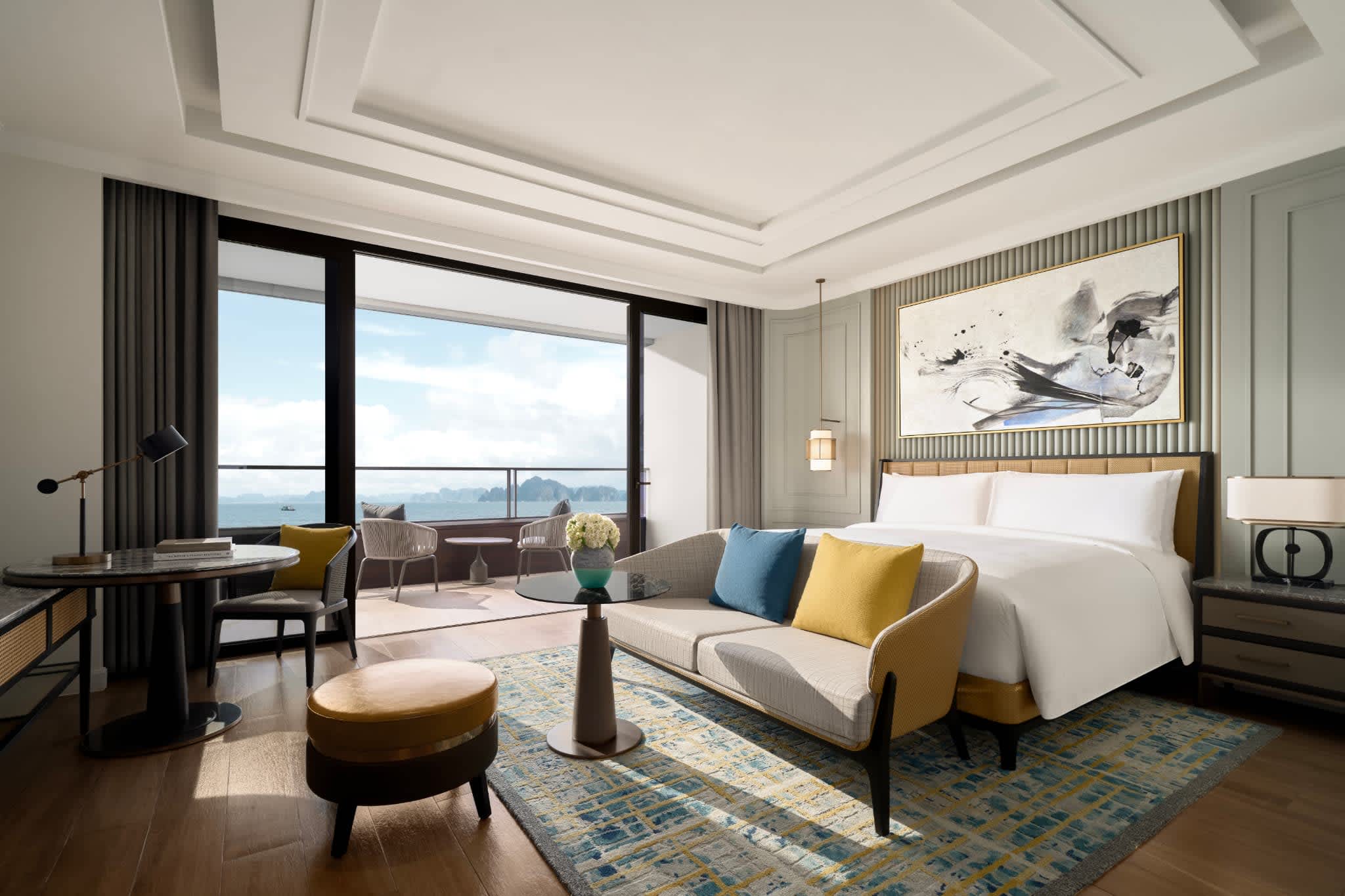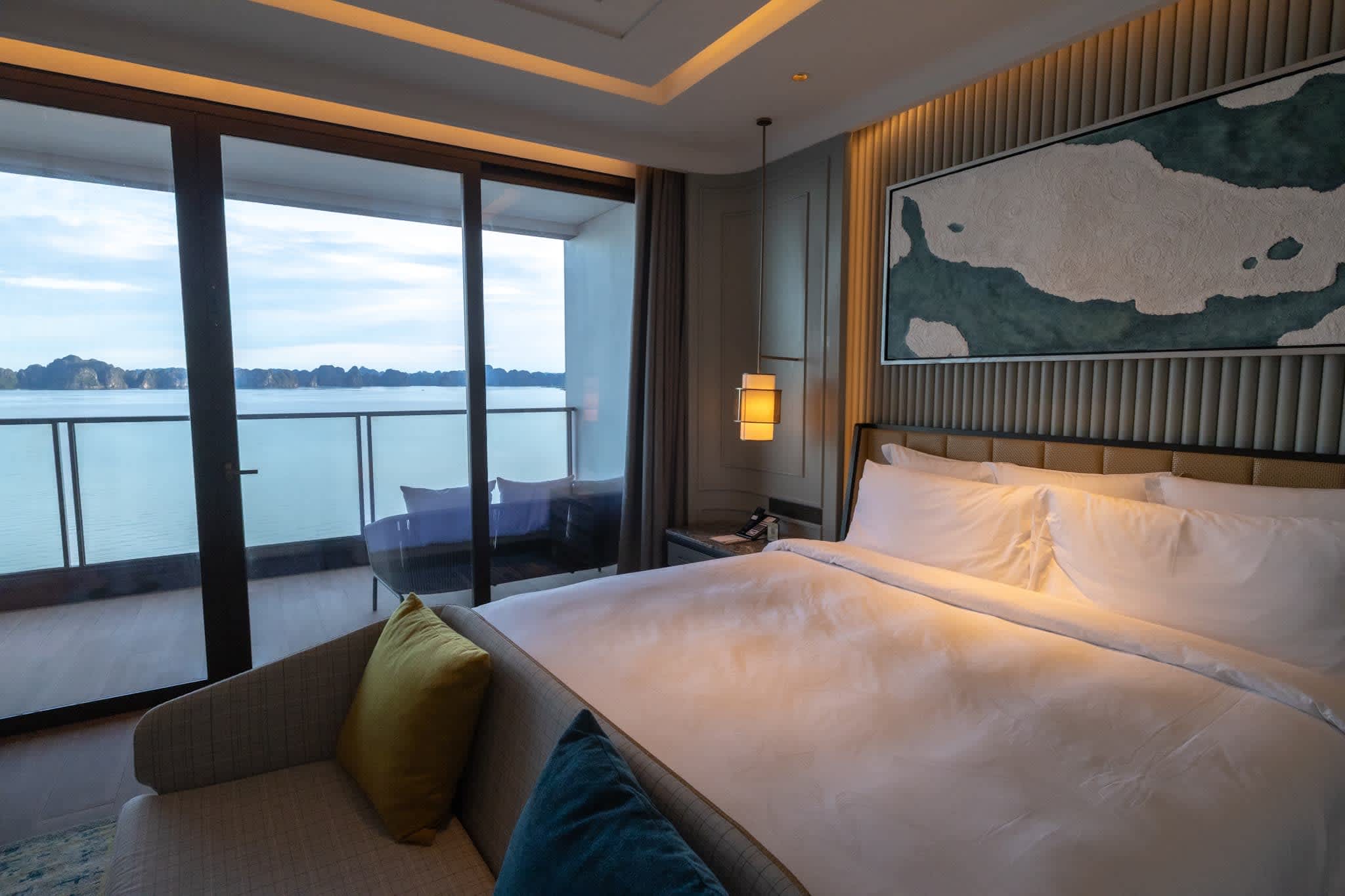 最もリーズナブルな価格のお部屋ですがお部屋の広さは十分、もちろんハロンベイビューです。大窓から自然光を取り込む落ち着いたシンプルなデザインで、最新ホテルらしく様々なソケットに対応した電源プラグや自動開閉式のカーテン、ラグジュアリーバスアメニティーなどレジャーにもビジネスにも対応した快適な仕上がりになっています。