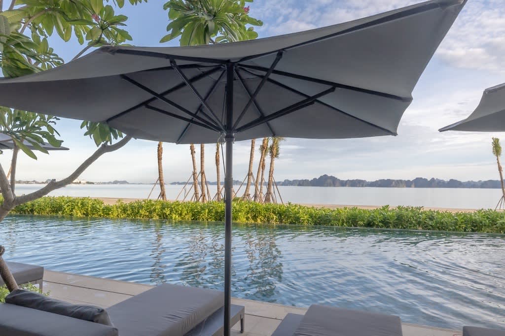 目の前にはプライベートビーチが広がり、警備員もいるので宿泊者以外は入れない独占ビーチとなってす。他のリゾート地と違い"コバルトブルーの青い海"とはならないハロン湾ですが透明度は案外高く綺麗です。何より湾内なので波がなく安全にビーチアクティビティを楽しめるのが魅力でもあります。